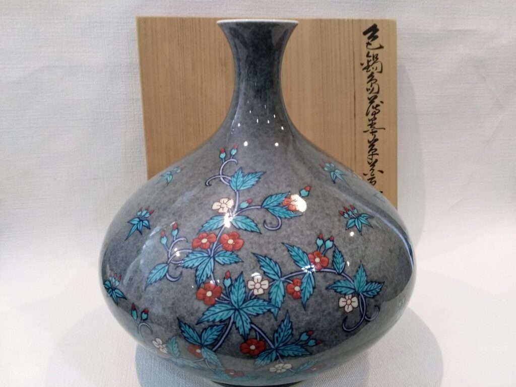 人間国宝 十三代 今泉今右衛門 色絵薄墨草 花更紗文花瓶を買取させて頂きました。