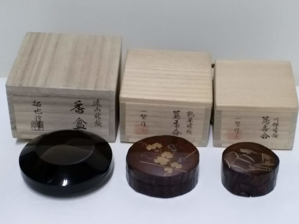 加賀蒔絵師「小谷一賀」作も二点と輪島塗蒔絵師日野卓也作の香合を買取致しました。